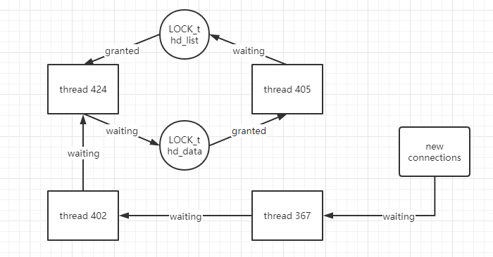 - 424线程持有LOCK_thd_list,等待LOCK_thd_data;而405线程持有LOCK_thd_list,等待LOCK_thd_list;双方互相持有对方等待的锁,互相阻塞,故而导致死锁