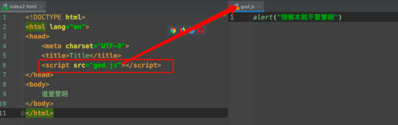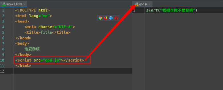 方案二, 将js代码写在js文件中, 然后通过script标签的src属性进行引入