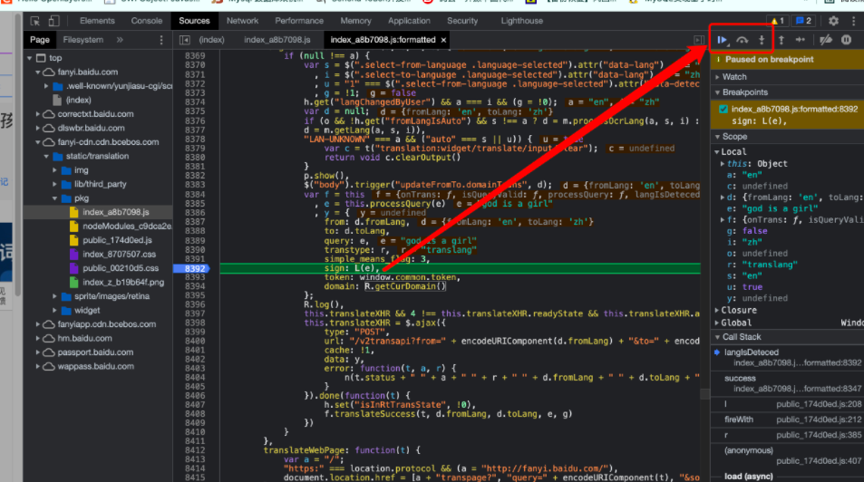 齐活. 剩下的就是L(e)了. 首先e是被翻译的内容. 所以这里是把"要翻译的内容"传递给了L. 但是这个L在哪里. 不好找. 很简单. 设置一个断点. 就可以.
