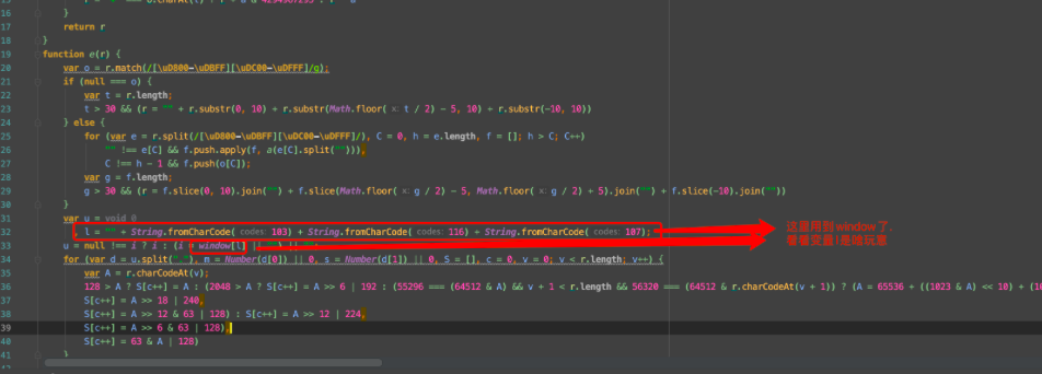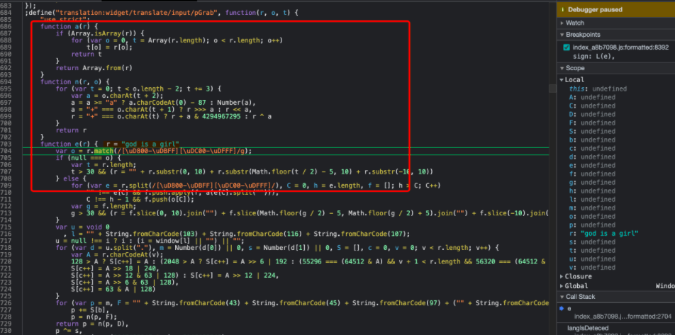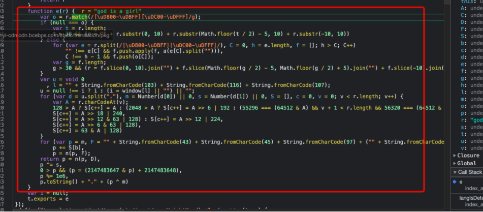 仔细观察下. 发现该函数内部只调用了n() a()函数. 其他函数都是js内置的东西.OK 向上简单寻找就发现了. 这里是一个大闭包.