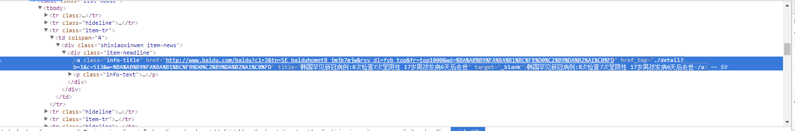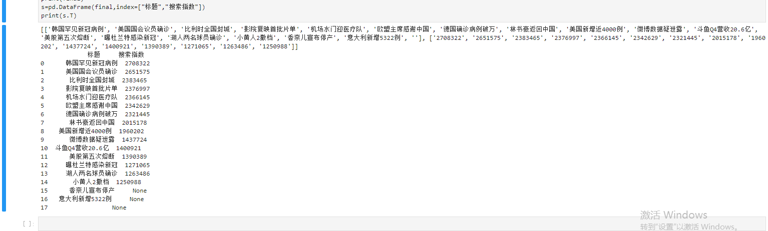 import requests from bs4 import BeautifulSoup import pandas as pd titles=[] hots=[] url='http://top.baidu.com/buzz?b=1&fr=topindex'#百度今日热搜 headers = {'User-Agent':'Mozilla/5.0 (Windows NT 6.3; Win64; x64) AppleWebKit/537.36 (KHTML, like Gecko)Chrome/69.0.3497.100 Safari/537.36'}#伪装爬虫 r=requests.get(url)#请求网站 r.raise_for_status() r.encoding = r.apparent_encoding html = r.text table = BeautifulSoup(html,"html.parser").find("table") soup=BeautifulSoup(html,'lxml')#使用工具 for m in soup.find_all(class_="list-title"): titles.append(m.get_text().strip()) for n in soup.find_all(class_="icon-rise"): hots.append(n.get_text().strip()) final=[titles,hots] print(final) s=pd.DataFrame(final,index=["标题","搜索指数"]) print(s.T)