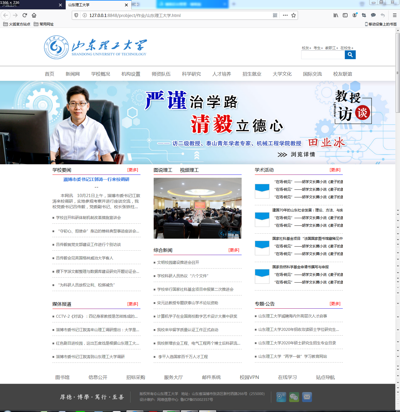 <!DOCTYPE html> <html> <head> <meta charset="utf-8"> <title>山东理工大学</title> <link rel="stylesheet" type="text/css" href="山东理工大学.css"/> </head> <body> <div id="back"> <div id="button"> <div class="secondButton">在校生+</div> <div class="secondButton">教职工+</div> <div class="secondButton">考生+</div> <div class="secondButton">校友+</div> </div> <div id="clear"></div> <div id="boxSecond"> <div id="search"><img src="../image/搜索.png"></div> <div id="input"><input type="text" name="search" placeholder=""></div> </div> </div> <HR align=center width=100% color=gray SIZE=1> <div id="box"> <div class="navList">首页</div> <div class="navList">新闻网</div> <div class="navList">学校概况</div> <div class="navList">机构设置</div> <div class="navList">师资队伍</div> <div class="navList">科学研究</div> <div class="navList">人才培养</div> <div class="navList">招生就业</div> <div class="navList">大学文化</div> <div class="navList">国际交流</div> <div class="navList">校友联谊</div> </div> <div id="picture"><img src="../image/长图.jpg" width="100%"></div> <div id="best"> <div class="center"> <div class="title1"> <div class="z"> 学校要闻 </div> <div class="y"> [更多] </div> </div> <div id="clear"></div> <div id="jb"></div> <div id="d">淄博市委书记江郭涛一行来校调研</div> <div id="--">--</div> <div id="text1"> 本网讯 10月21日上午,淄博市委书记江敦涛来校调研, 实地参观考察并进行座谈交流,我校党委书记吕传毅,党 委副书记、校长张铁柱,党委常委、副校长刘国华、王立 斌、易维明,淄博市委常委、秘书长毕司东,市委常委、 组织部长高庆波,市委常委、副市长杨洪涛,我校和淄博 市相关部门负责人,专家学者参加调研活动。 </div> <div id="T1"> <div class="text2"><li>学校召开科研体制机制改革措施宣讲会</li> </div> <div class="text2"><li>“守初心、担使命”身边的榜样典型事迹座谈会召开</li> </div> <div class="text2"><li>吕传毅就党支部建设工作进行个别访谈</li> </div> <div class="text2"><li>吕传毅会见英国格林威治大学客人</li> </div> <div class="text2"><li>稷下学派文献整理与数据库建设研究开题论证会举行</li> </div> <div class="text2"><li>“为科研人员放权让利、松绑减负”</li> </div> </div> <div class="title1"> <div class="z"> 媒体报道 </div> <div class="y"> [更多] </div> </div> <div id="clear"></div> <div id="jb"></div> <div id="T2"> <div class="text2"> <li>CCTV-2《对话》:四亿身家教授是怎样炼成的?(20190721) </li> </div> <div class="text2"> <li>淄博市委书记江敦涛来山理工调研提出:大学是城市重要的创新源 </li> </div> <div class="text2"> <li>红色剧目进校园,这出五音戏是根据山东理工大学党委书记吕传毅诗歌改编! </li> </div> <div class="text2"> <li>淄博市委书记江敦涛到山东理工大学调研 </li> </div> </div> </div> <div class="center"> <div class="title1"> <div class="z"> 图说理工 </div> <div id="x"> 视频理工 </div> </div> <div id="clear"></div> <div id="jb"></div> <div id="T3"> <div id="pic"> <img src="../image/中间图.jpg" width="300px"> </div> </div> <div class="title1"> <div class="z"> 综合新闻 </div> <div class="y"> [更多] </div> </div> <div id="clear"></div> <div id="jb"></div> <div id="T4"> <div class="text2"> <li>文明校园建设推进会召开</li> </div> <div class="text2"> <li>学校科研人员热议“六个文件” </li> </div> <div class="text2"> <li>学校举行国家社科基金项目申报第二次推进会 </li> </div> <div class="text2"> <li>宋元达教授专题获泰山学术论坛资助 </li> </div> <div class="text2"> <li>计算机学子在全国高校数字艺术设计大赛中获奖</li> </div> <div class="text2"> <li>我校来华留学质量认证工作正式启动</li> </div> <div class="text2"> <li>我校新增农业工程、电气工程两个博士后科研流动站</li> </div> <div class="text2"> <li> 李平入选国家百千万人才工程 </li> </div> </div> </div> <div class="center"> <div class="title1"> <div class="z"> 学术活动 </div> <div class="y"> [更多] </div> </div> <div id="clear"></div> <div id="jb"></div> <div id="List"> <div id="nnn"></div> <div class="n"> <div class="n1"><img src="../image/shi.jpg" ></div> <div class="n2"> <p>“在场·锐见”——胡学文长篇小说《麦子的盖头》研讨会</p> <p>“在场·锐见”——胡学文长篇小说《麦子的盖头》研讨会</p> <p>“在场·锐见”——胡学文长篇小说《麦子的盖头》研讨会</p> </div> </div> <div id="ns"></div> <div class="n"> <div class="n1"><img src="../image/shi.jpg" ></div> <div class="n2"> <p>建国70年的山东社会发展:理论、方法、 与实践——山东省社会学学会2019年学术年会</p> <p>“在场·锐见”——胡学文长篇小说《麦子的盖头》研讨会</p> <p>“在场·锐见”——胡学文长篇小说《麦子的盖头》研讨会</p> </div> </div> <div id="ns"></div> <div class="n"> <div class="n1"><img src="../image/shi.jpg" ></div> <div class="n2"> <p>国家社科基金项目“法国国家图书馆藏稀见中文古籍研究”开题</p> <p>“在场·锐见”——胡学文长篇小说《麦子的盖头》研讨会</p> <p>“在场·锐见”——胡学文长篇小说《麦子的盖头》研讨会</p> </div> </div> <div id="ns"></div> <div class="n"> <div class="n1"><img src="../image/shi.jpg" ></div> <div class="n2"> <p>国家自然科学基金申请书撰写与申报</p> <p>“在场·锐见”——胡学文长篇小说《麦子的盖头》研讨会</p> <p>“在场·锐见”——胡学文长篇小说《麦子的盖头》研讨会</p> </div> </div> <div id="ns"></div> </div> <div id="fg"></div> <div class="title1"> <div class="z"> 专题·公告 </div> <div class="y"> [更多] </div> </div> <div id="clear"></di
