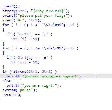 也就是说,str1经过一系列变化后,变成了与str2相等的字符串。按照上面的逻辑,将str里的4换成a,3换成e就可以还原出str1了