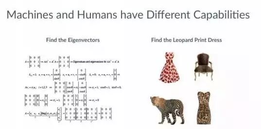 消除这种误解的主要理由是机器和人的技能是互补的。从上面的图中我们可以看出机器在处理结构化计算方面有优势。机器擅长“找到特征向量”的任务,不太擅长“找到豹纹裙”任务。人类在识别意义和背景上具有得天独厚的优势。人类很容易“找到豹纹裙”,但在“找到特征向量”方面跟机器相比不具有优势。