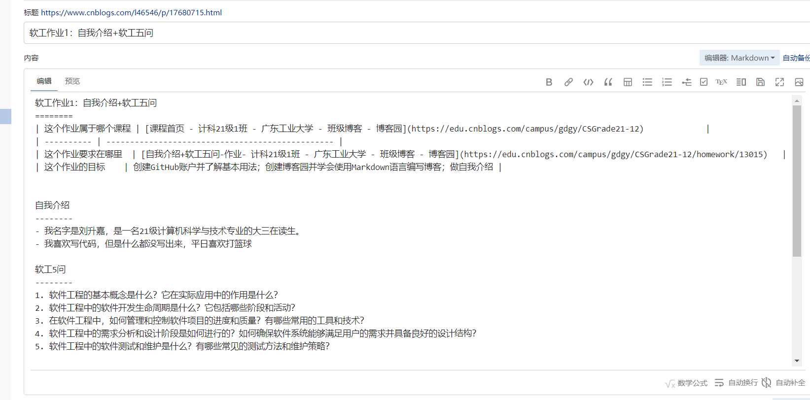 | 这个作业要求在哪里 | 自我介绍+软工五问-作业- 计科21级1班 - 广东工业大学 - 班级博客 - 博客园 |