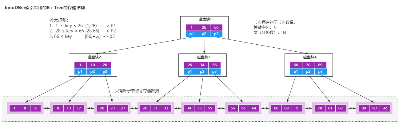 - B树的数据存储在每个节点上,而B+树中的数据是存储在叶子节点,并且通过链表的方式把叶子节点中的数据进行连接。