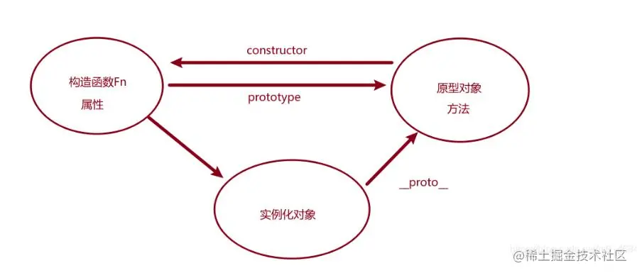 首先从构造函数说起,构造函数通过prototype指向他的原型对象,原型对象通过他的constructor属性指回这个构造函数,表明原型对象是由哪个构造函数生成的。原型对象通过new关键字生成的实例对象,这个实例对象可以通过__proto__属性指向生成这个实例对象的构造函数的原型对象,实现一个三角关系。