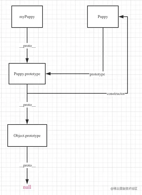 必须留意的是,最后的Object的prototype的隐形原型__proto__指向null,是为避免出现原型链的死循环