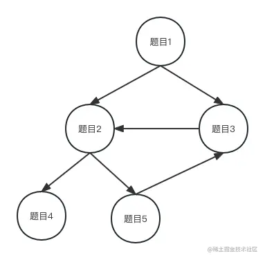 - 简单介绍需求,通过可视化流程配置答题流程,题目与题目之间用线连接,箭头的方向代表下一个题目。回答完当前题目,根据不同的条件,跳到下一题;如果题目流程中有循环,会导致答题流程无法结束,所以需要校验题目的流程中不能有循环。