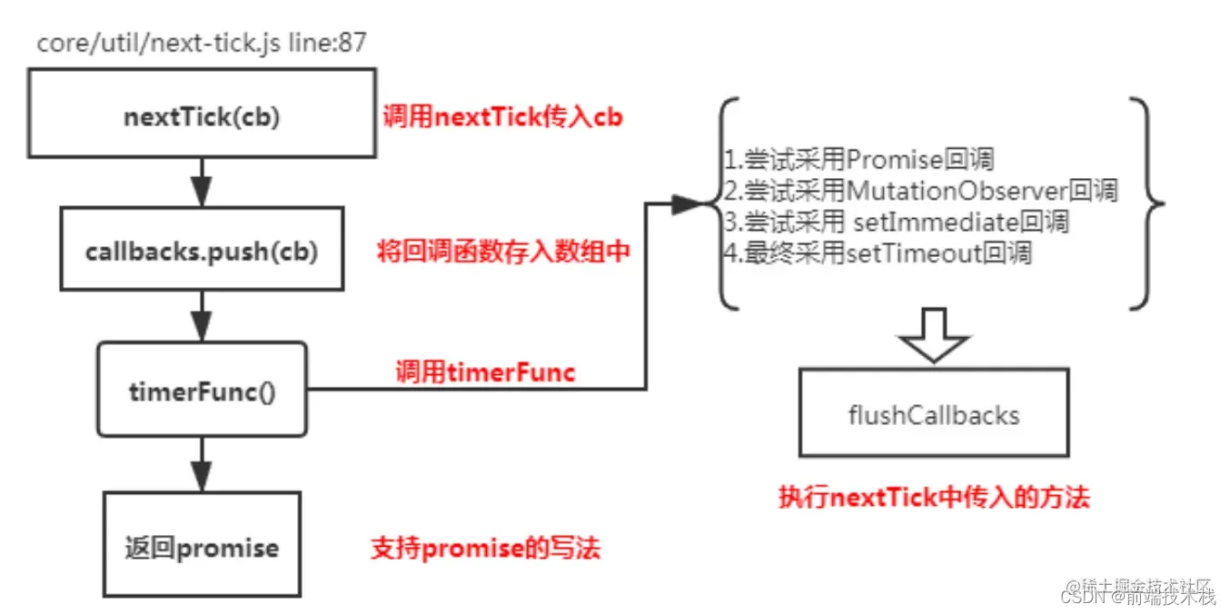 nextTick 方法主要是使用了宏任务和微任务,定义了一个异步方法.多次调用 nextTick 会将方法存入队列中,通过这个异步方法清空当前队列。所以这个 nextTick 方法就是异步方法