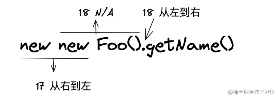 在上一问里成员访问优先级是18,new(无参列表)优先级是17,优先级不同,则高优先级先执行,所以上一问先执行 Foo.getName();这一问里 new(带参列表)优先级与成员访问同属18,优先级相同,并行下看结合性,new 带参时结合性不相关,所以直接执行,成员访问结合性从左到右,所以先拿出 Foo() 执行,于是得出了上面等价于 (new Foo()).getName() 的结论。