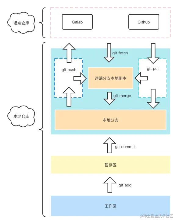 除此之外,还有一个特殊的区域,那就是本地的 git 储存区,它是用来干嘛的呢?一般来说你可能在某些场景下会用到它,我们有的时候本地改了代码,但是突然有个人过来问你另一个分支的问题,同时这个时候你在实现某个功能,实现一半,又不想提交到 Git 仓库中,那么你就可以考虑使用 git stash save "临时存一下",这个时候它就会帮你存到这个储存区,你去其他分支做完事情回来,再 git stash pop就好了。