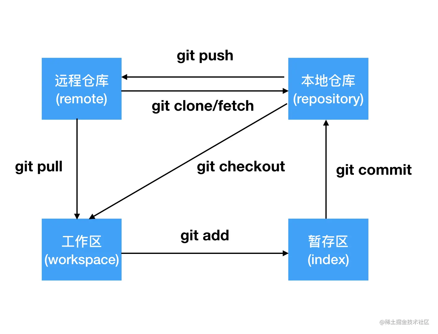 - 本地仓库:指在本地仓库中的 git commit 后的代码区域;