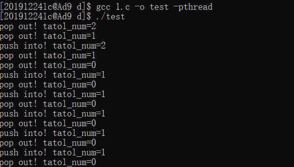 #include<stdio.h> #include<stdlib.h> #include<unistd.h> #include<semaphore.h> #include<pthread.h> #define msleep(x) usleep(x*1000) #define PRODUCT_SPEED 3 //生产速度 #define CONSUM_SPEED 1 //消费速度 #define INIT_NUM 3 //仓库原有产品数 #define TOTAL_NUM 10 //仓库容量 sem_t p_sem, c_sem, sh_sem; int num=INIT_NUM; void product(void) //生产产品 { sleep(PRODUCT_SPEED); } int add_to_lib() //添加产品到仓库 { num++;//仓库中的产品增加一个 msleep(500); return num; } void consum() //消费 { sleep(CONSUM_SPEED); } int sub_from_lib() //从仓库中取出产品 { num--; //仓库中的产品数量减一 msleep(500); return num; } void *productor(void *arg) //生产者线程 { while(1) { sem_wait(&p_sem);//生产信号量减一 product();// 生产延时 sem_wait(&sh_sem);//这个信号量是用来互斥的 printf("push into! tatol_num=%d\n",add_to_lib()); sem_post(&sh_sem); sem_post(&c_sem); //消费信号量加一 } } void *consumer(void *arg) //消费者线程 { while(1) { sem_wait(&c_sem); //消费者信号量减一 sem_wait(&sh_sem); printf("pop out! tatol_num=%d\n",sub_from_lib()); sem_post(&sh_sem); sem_post(&p_sem);//生产者信号量加一 consum();//消费延时 } } int main() { pthread_t tid1,tid2; sem_init(&p_sem,0,TOTAL_NUM-INIT_NUM); sem_init(&c_sem,0,INIT_NUM); sem_init(&sh_sem,0,1); pthread_create(&tid1,NULL,productor,NULL); pthread_create(&tid2,NULL,consumer,NULL); pthread_join(tid1,NULL); pthread_join(tid2,NULL); return 0; }