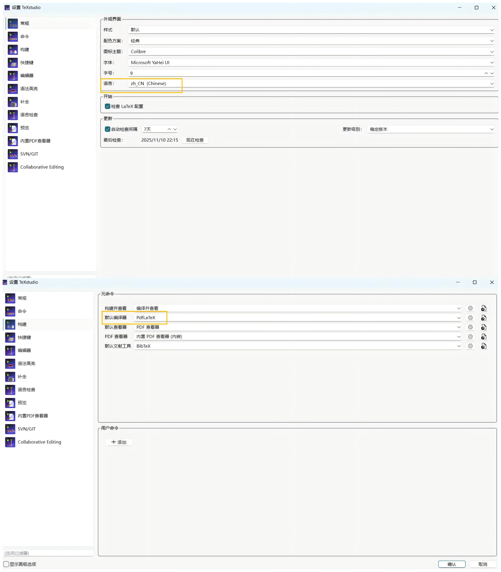 第一次启动后,在菜单中设置 → “编译器路径”中选择语言及对应的 pdflatex 或 xelatex;