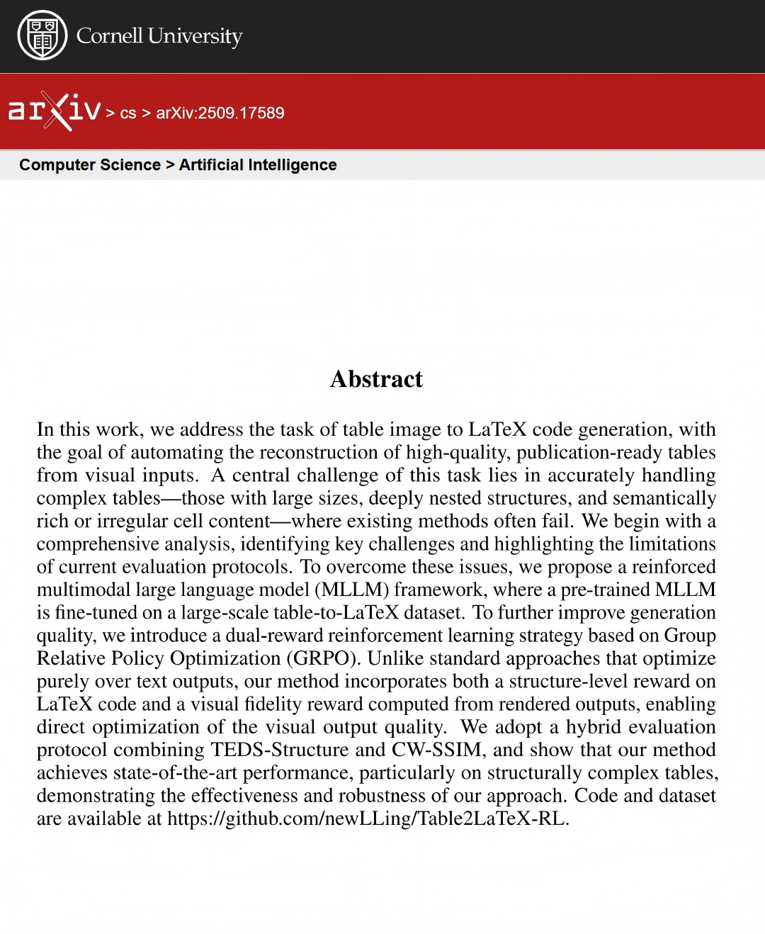 论文标题:Table2LaTeX-RL: High-Fidelity LaTeX Code Generation from Table Images via Reinforced Multimodal Language Models