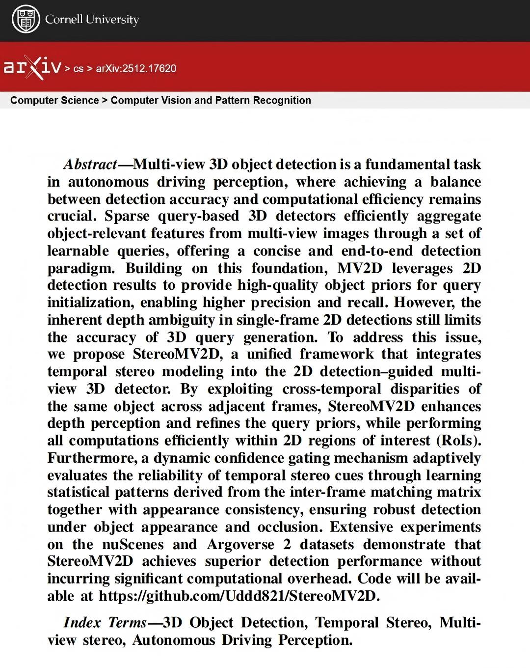 论文标题:StereoMV2D: A Sparse Temporal Stereo-Enhanced Framework for Robust Multi-View 3D Object Detection