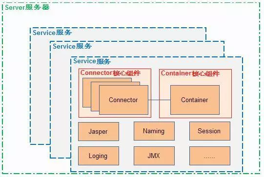 从tomcat的架构图来看,tomcat的核心组件有Server、Service、Connector、Container。