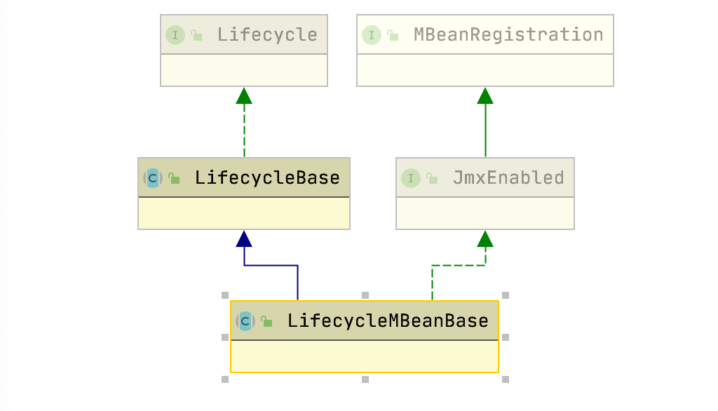 那么tomcat是如何实现通过控制反转创建四大件的?从createStartDigester方法可以看出在创建解析器时代码上写了很多解析规则(Rule),比如Server的实现类是org.apache.catalina.core.StandardServer继承于LifecycleMBeanBase类,而LifecycleMBeanBase类继承了LifecycleBase并实现了JmxEnabled接口,这样我们只要查看对应的解析规则和父类就可以看到Server是如何被实例化的。