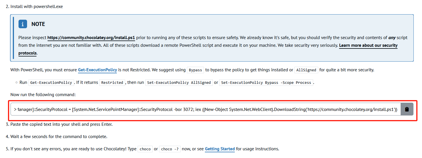 Chocolatey的官方地址:https://chocolatey.org/install#individual