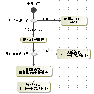 将一块内存块分为大小间距为8字节的16种内存块,大小从8字节-128字节,然后用数组+链表方式管理(free_list[16],每个free_list维护一个链表,链表里存放着大小相同的内存块)。每个数组(free_list)中存储的是大小相同的用链表连接起来的内存块。申请内存的请求到达后,先将请求的内存块大小按8的倍数对齐,然后检查所申请的内存块对应的数组中链表是否为空,若不为空则直接返回第一个节点给程序。二级配置器还维护一个内存池,若对应的数组中链表为空则像内存池申请,调用refill 函数从内存池取出空间(取空间要调用chunk_alloc函数,默认取出20个对应需求块大小)挂在该大小的数组free_list的链表下,再分配给所需程序。若内存池为空则用malloc申请。若malloc不够的话则发出异常。