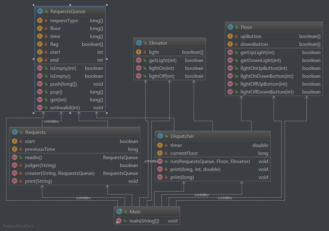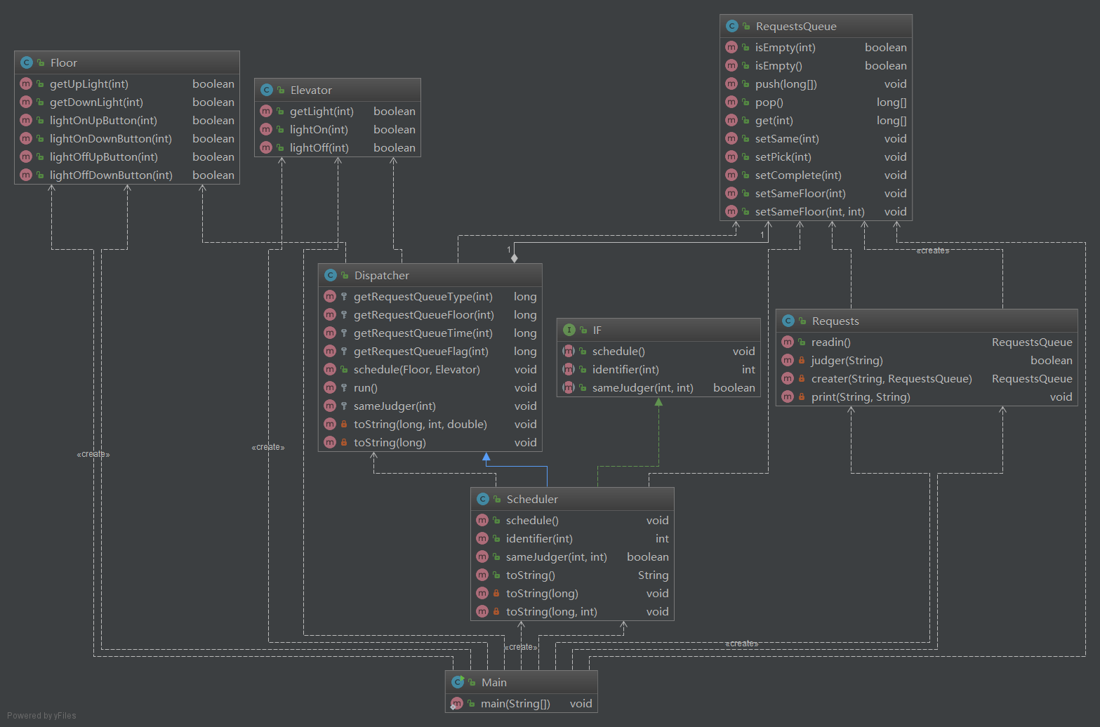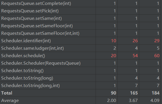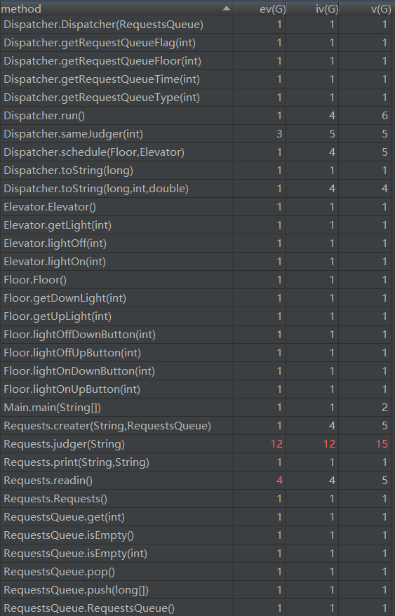 这次作业在第二次的基础上增加了捎带的内容,新加的scheduler类在继承dispatcher类的基础上,重写了有关捎带的内容。这一部分我采用的是递归和循环扫描的方法,此外由于对于指令的分类情况较多,最多出现了四五层的if嵌套,因此有关指令扫描的identifier和schedule方法的复杂度较高。由于修改了第二次作业中的dispatcher类,进行了更为明确的分工和简化,其复杂度有所下降。
