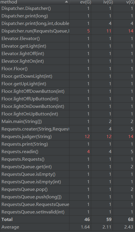本次作业我使用循环扫描的方法处理同质请求等,因此Dispatcher的run方法由于涉及到读入一个请求后扫描其后的请求,需要循环,因此复杂度较高。request类的judger方法用于判断输入格式,由于if-else的数量较多,因此复杂度也较高。不过,虽然当时没有代码复杂度的分析,在第三次作业正式开始编码之前,我先修改、精简了第二次作业的算法,在第三次作业中的代码复杂度分析中可以看出。
