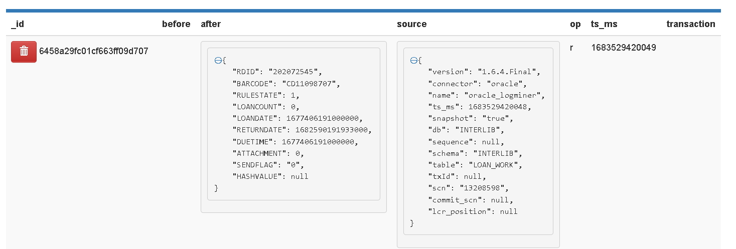 { "_id": "ObjectId('64589d0022308d4b25e8c8ba')", "before": null, "after": { "RDID": "300603", "BARCODE": "CD11115345", "RULESTATE": 1, "LOANCOUNT": 0, "LOANDATE": 1667407539000000, "RETURNDATE": 1675183539434000, "DUETIME": 1667407539000000, "ATTACHMENT": 0, "SENDFLAG": "0", "HASHVALUE": null }, "source": { "version": "1.6.4.Final", "connector": "oracle", "name": "oracle_logminer", "ts_ms": 1683528934877, "snapshot": "true", "db": "INTERLIB", "sequence": null, "schema": "INTERLIB", "table": "LOAN_WORK", "txId": null, "scn": "13206765", "commit_scn": null, "lcr_position": null }, "op": "r", "ts_ms": 1683528934877, "transaction": null }