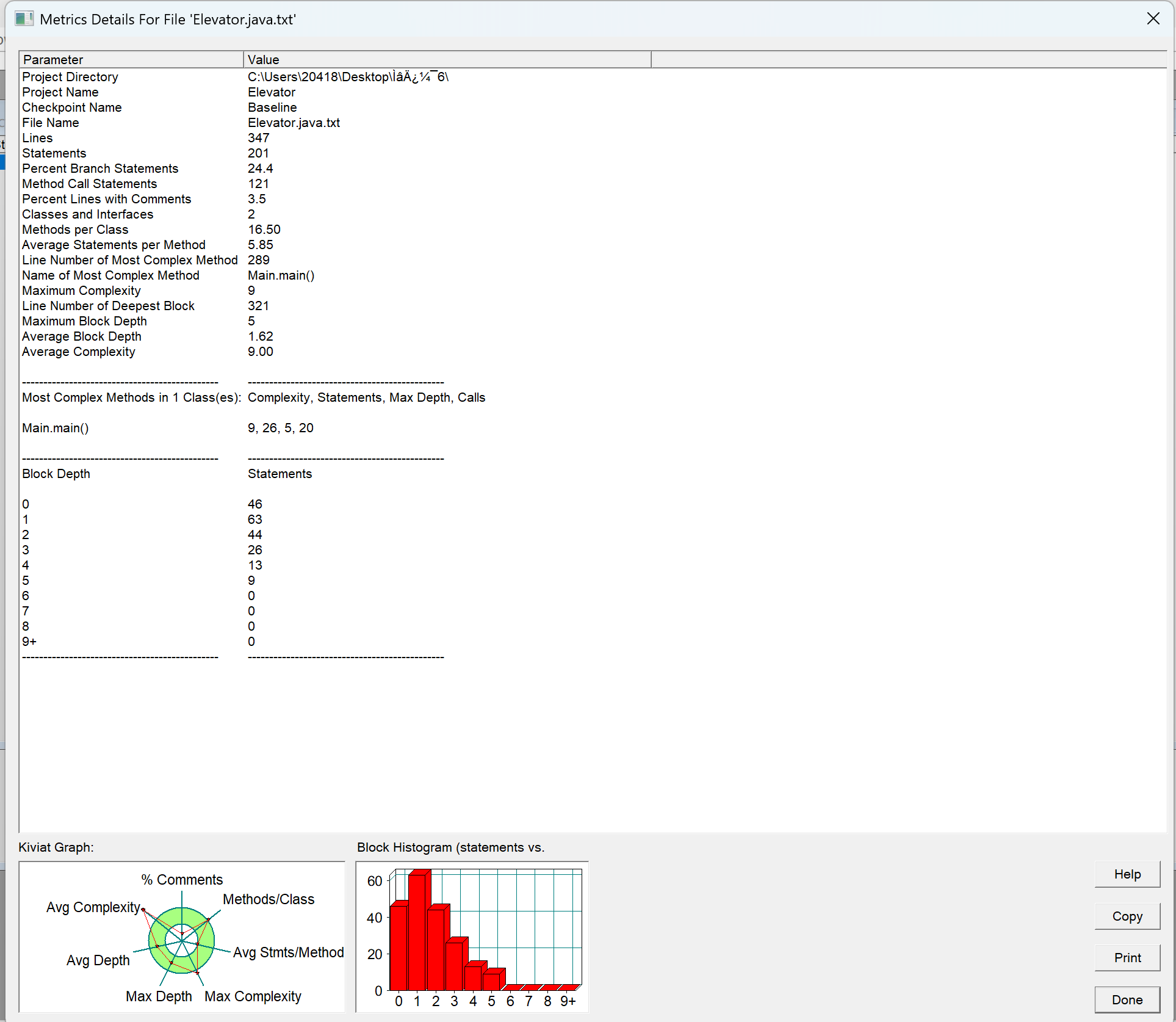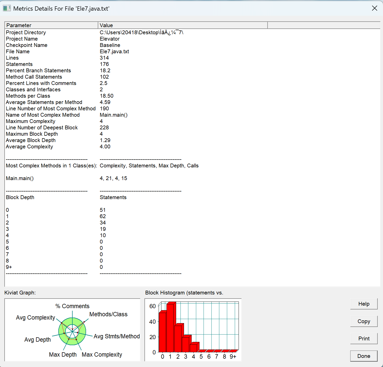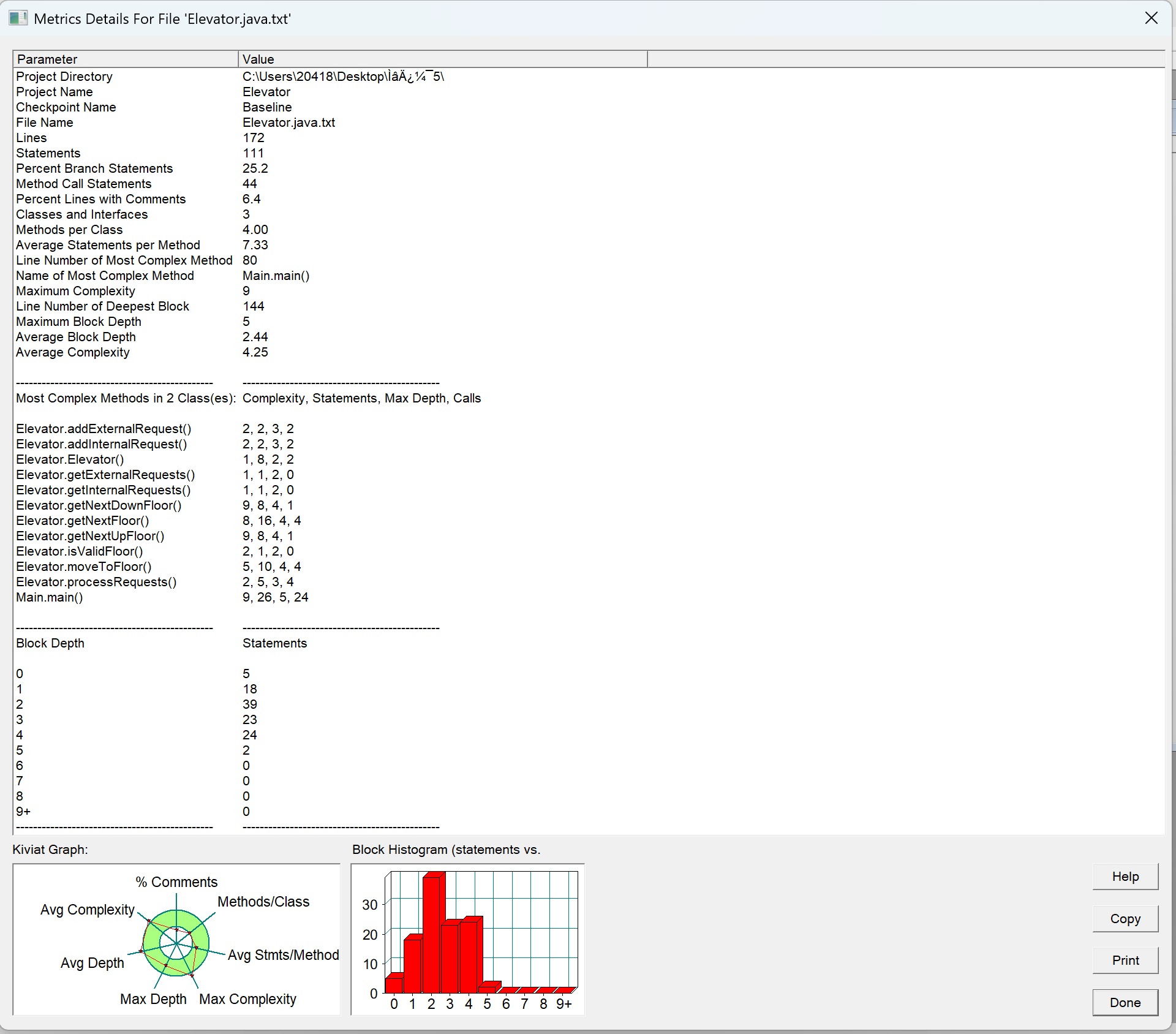 分析可知,我的代码功能模块划分较清晰,通过 Direction 和 State 枚举类来定义电梯的运行方向和状态。但是从度量报告可知,平均复杂度为 9.00 ,且 Main.main() 方法复杂度达到 9 ,行数较多(289 行 ) 。较高的复杂度意味着代码逻辑可能较为混乱,难以理解和调试。可能存在方法功能过于复杂、嵌套过多、代码重复等问题,导致代码的可维护性降低。含注释的代码行占比仅 3.5% ,缺乏注释。同时某些类的方法数量较多(平均每个类的方法数为 16.50 ),可能存在类的职责不够单一的情况,将过多功能集中在一个类中,导致类的功能边界不够清晰,增加了理解和维护的难度。