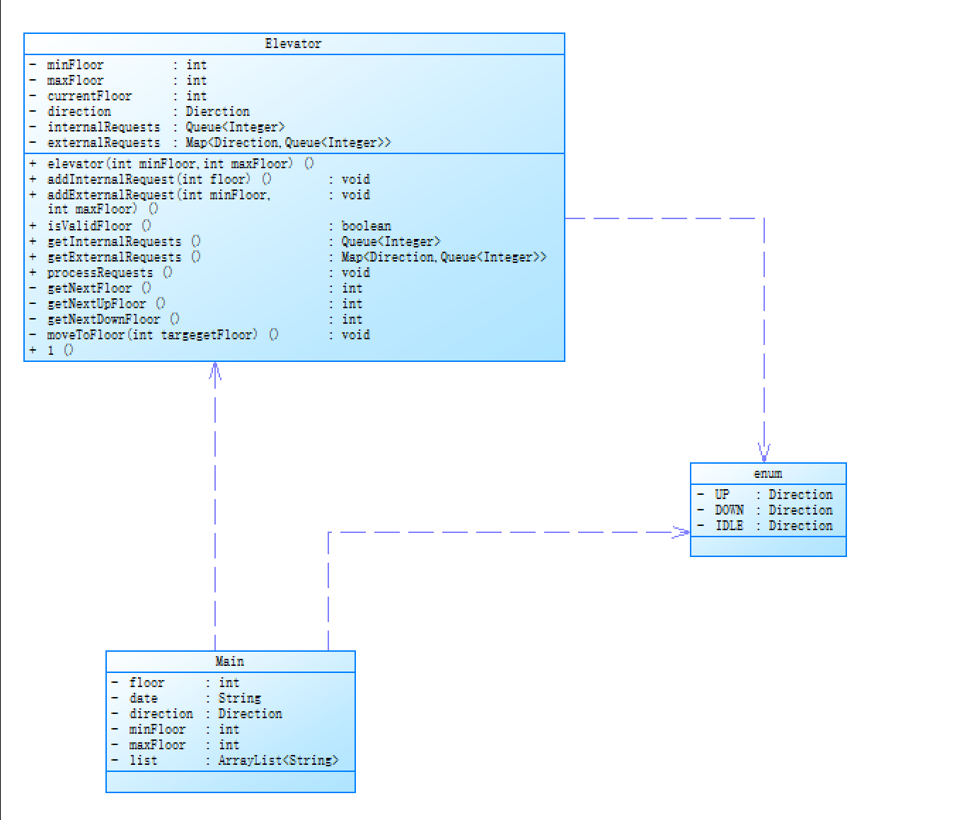 这张类图设计了Elevator、Direction、enum和Main类。Elevator 类依赖 Direction 枚举类来定义电梯运行方向相关逻辑;Main 类依赖 Elevator 类来创建电梯对象并