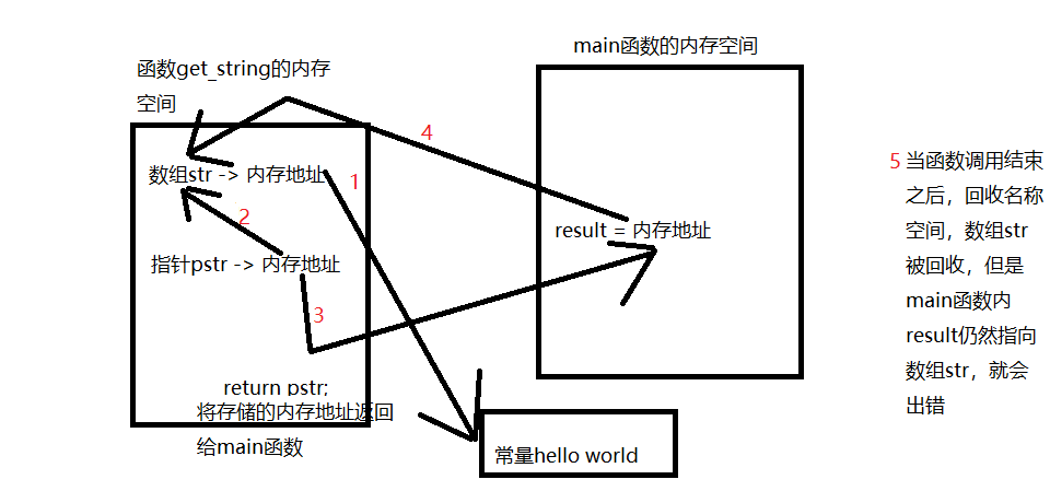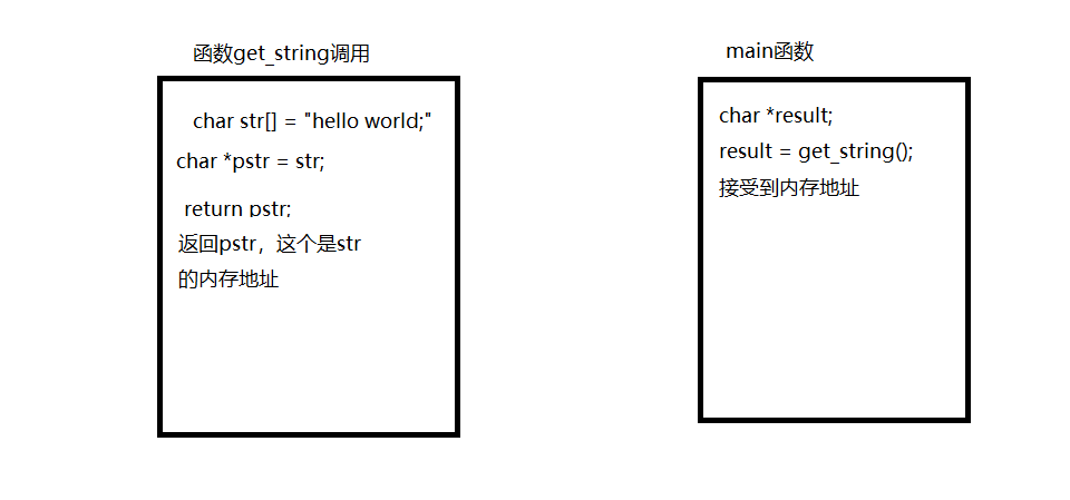 #include <stdio.h> char *pa(); char *pa(){ char str[] = "hello world"; char *pstr = str; return pstr; } int main(){ char *result; result = pa(); printf("%s\n",result); return 0; }