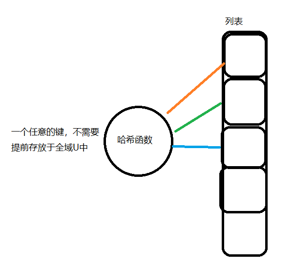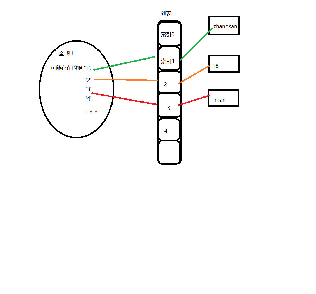 存在一个全域U,它存储所有可能出现的键的名称;并且存在一个用于存储实际值的列表,全域U中存在的每一个键都与这个列表的下标唯一对应