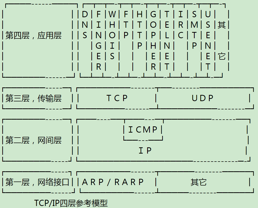 3. 网间层:对应网络层,本层包含IP协议,RIP(Routing Information Protocol)协议(路由信息协议),负责数据的包装,寻址和路由。同时还包含网间控制报文协议(Internet Control Message Protocol, ICMP),用来提供网络诊断信息