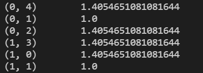 \((0,4)\) 表示第 \(0\) 个字符串,词汇表里第 \(4\) 个单词的 \(TF-IDF\) 值。计算过程为:单词 \(travel\) 在第 \(0\) 个字符串也就是语料库的第一个句子中,词频为 \(TF=1\) ,逆文档频率 \(IDF = log\frac{2+1}{1+1}+1 = log\frac{3}{2}+1=1.40546108\),\(TF-IDF=TF\times IDF=1\times 1.40546 = 1.40546108\)。其他单词同理。