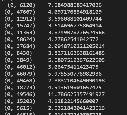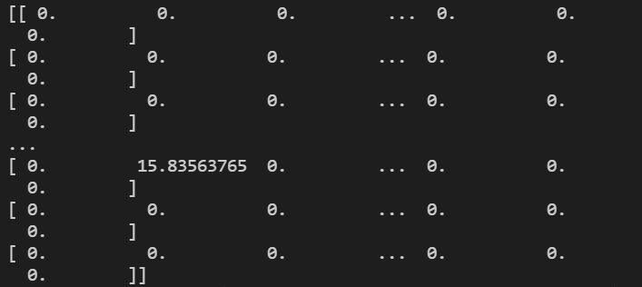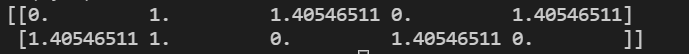 结合 \(toarray()\) 转成数据矩阵形式进行显示,这个矩阵是一个稀疏矩阵,如图,\((0,0)\)位置的值为 \(0\) ,解释为第 \(0\) 个字符串,词汇表里第 \(0\) 个单词,也就是 \(car\),实际中根本没有在语料库第一句中出现,因此值为 \(0\)。由于当文本量庞大的时候,矩阵将会变得十分巨大,不利于显示,因此后续不做输出。