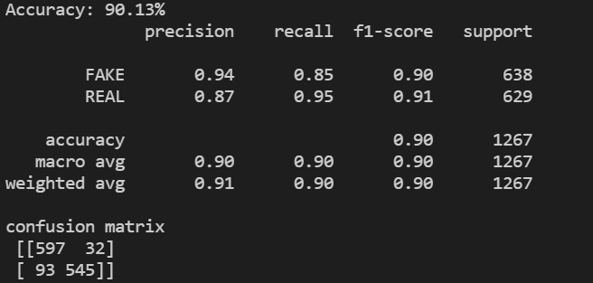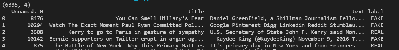 观察数据可以看见,有 \(4\) 列数据共 \(6335\) 条,标签 \(label\) 分为 "\(FAKE\)" 和 "\(REAL\)" 两类,获取标签。然后对数据集进行分割,分割为训练集和测试集,采用对 "\(text\)" 和 "\(label\)" 列数据进行分割,分割的测试集大小为 \(0.2\),\(random\_state\) 是随机数种子,设置的数字相同能保证每次拆分的数据集是一样的。