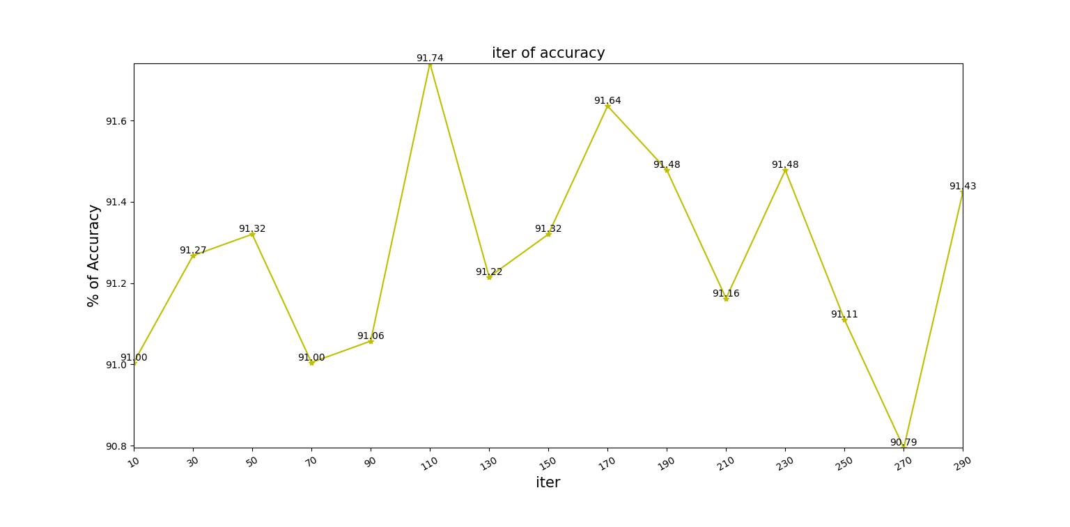 绘出准确率与迭代次数之间的折线图。观察下图可以看出迭代次数会影响分类效果。