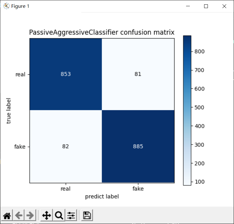 调用机器学习 "\(sklearn\)" 里的 "\(linear\_model\)" 里的 "\(PassiveAggressiveClassifier\)" 分类模型,设置参数 \(max\_iter\) ,可以调整迭代次数观察对于最后准确率的影响(迭代次数设置越大,分类准确率越大)。