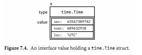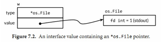 2.这个接口值的动态类型被设置为*os.Stdout的类型描述符,它的动态值持有*os.Stdout的拷贝,从而可以访问到os.File的值