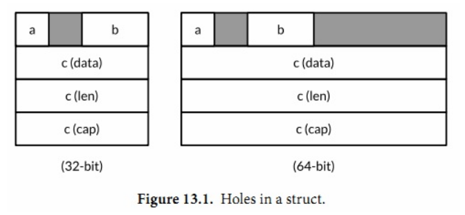由于内存对齐的存在,对于一个聚合类型(结构体或者数组)的大小至少是所有字段或者元素大小的总和,或者更大从而产生内存空洞