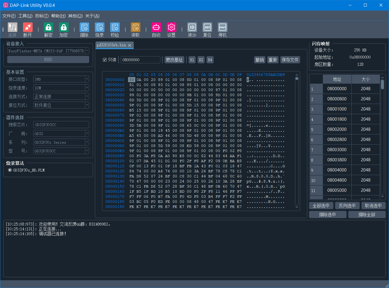 平常使用的国产芯片种类非常多,苦DAPLink没有好用的上位机久已,所以自己做了一个通用的DAPLink上位机,实现方式是解析的.pack包,理论上只要keil能够烧录,上位机就可以在线读写烧录~