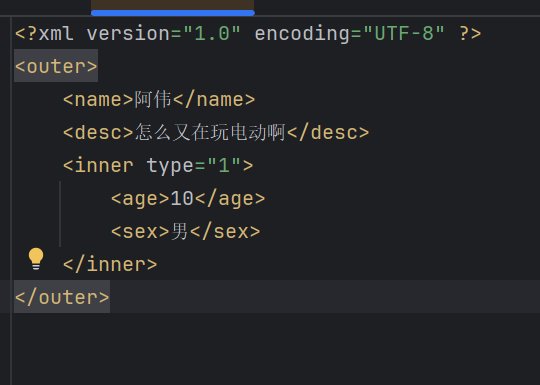 5.标签中可以存在属性。比如上面的type=“1”就是inner标签的一个属性,属性的值由单引号或双引号包括