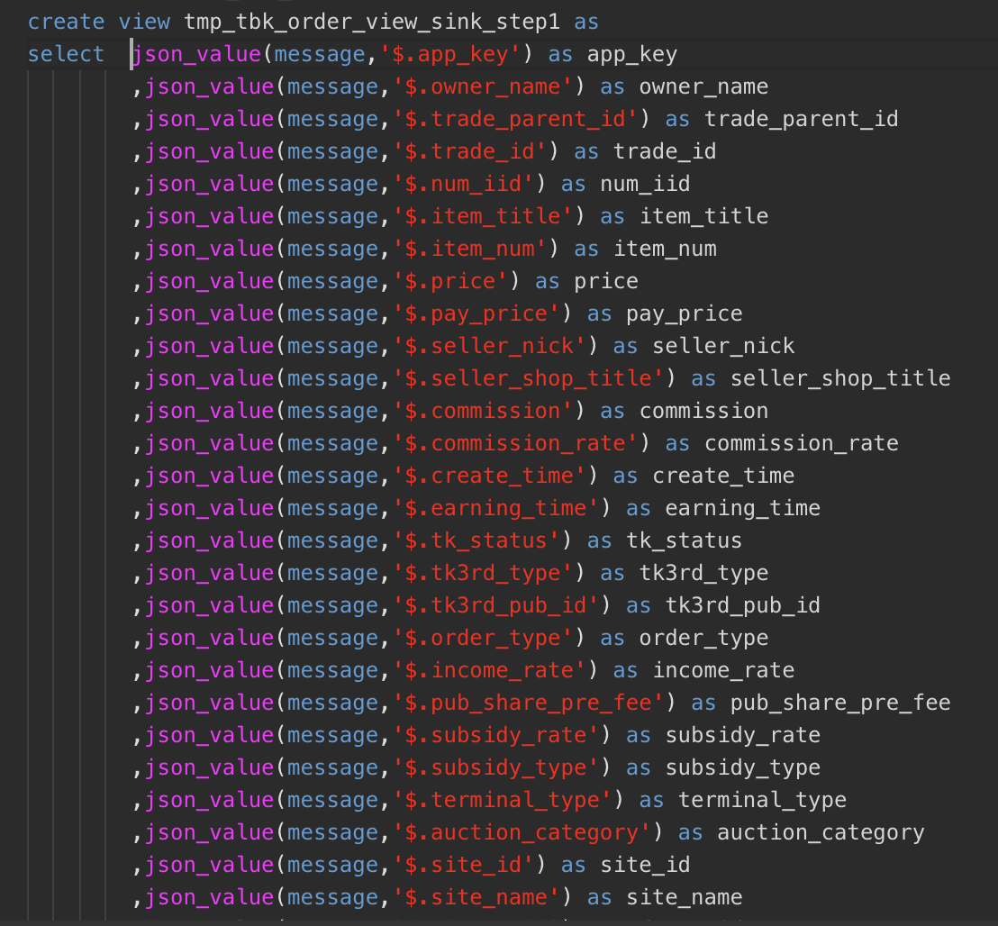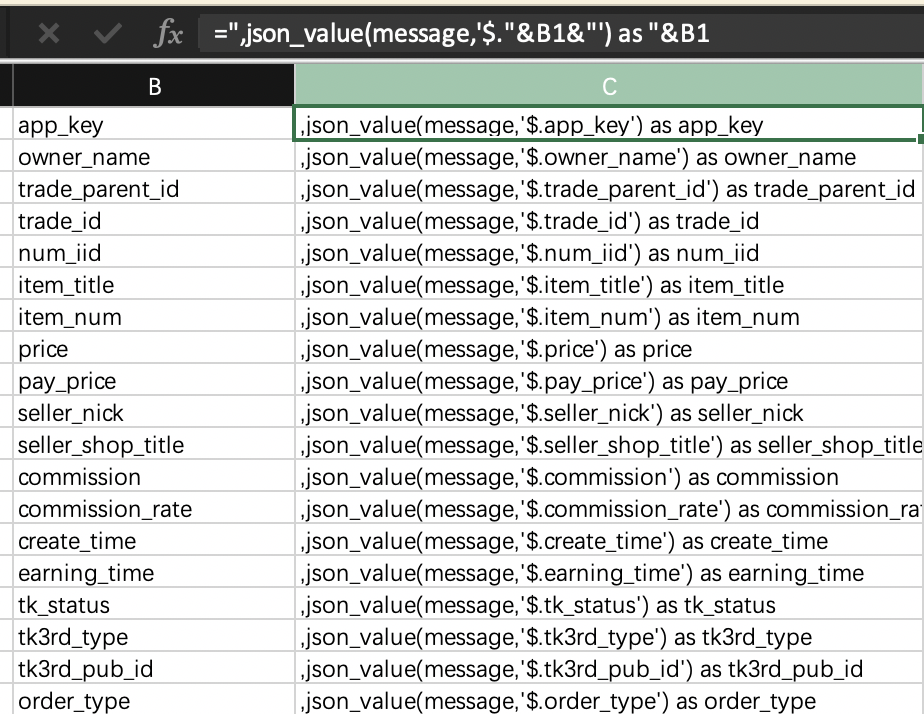 然后:第一列函数操作下:=",json_value(message,'$."&B1&"') as "&B1