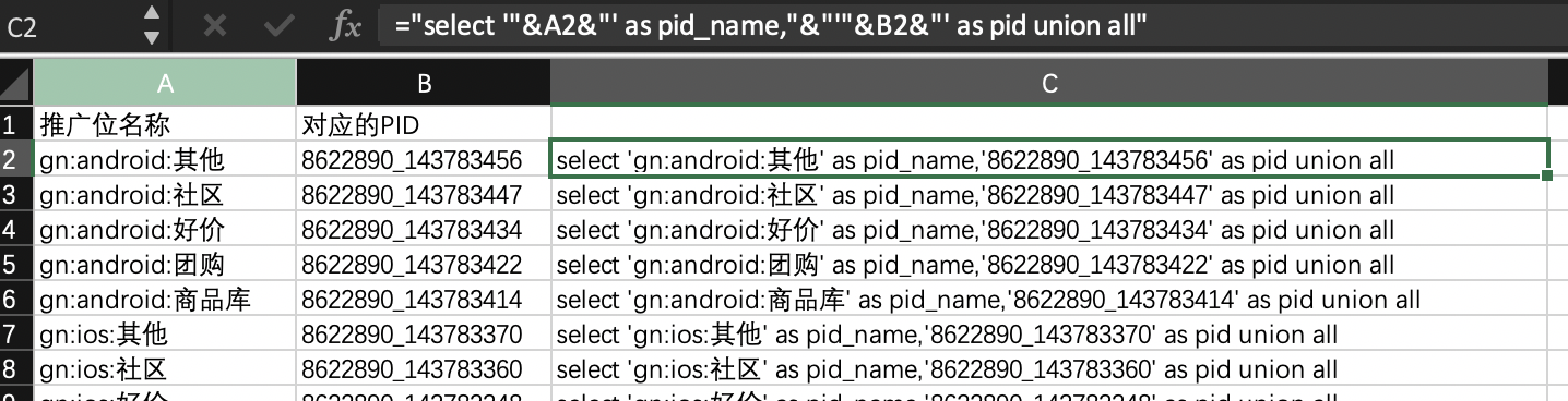 还有一个生成sql的沙雕东西,记录下:="select '"&A2&"' as pid_name,"&"'"&B2&"' as pid union all"