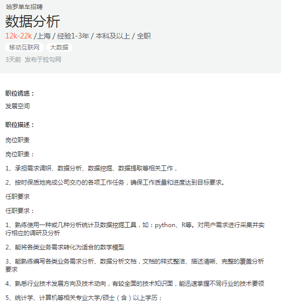 对于数据分析这个工作我们先看下招聘要求都会怎么写,以上海的1-3年本科要求的岗位为例: