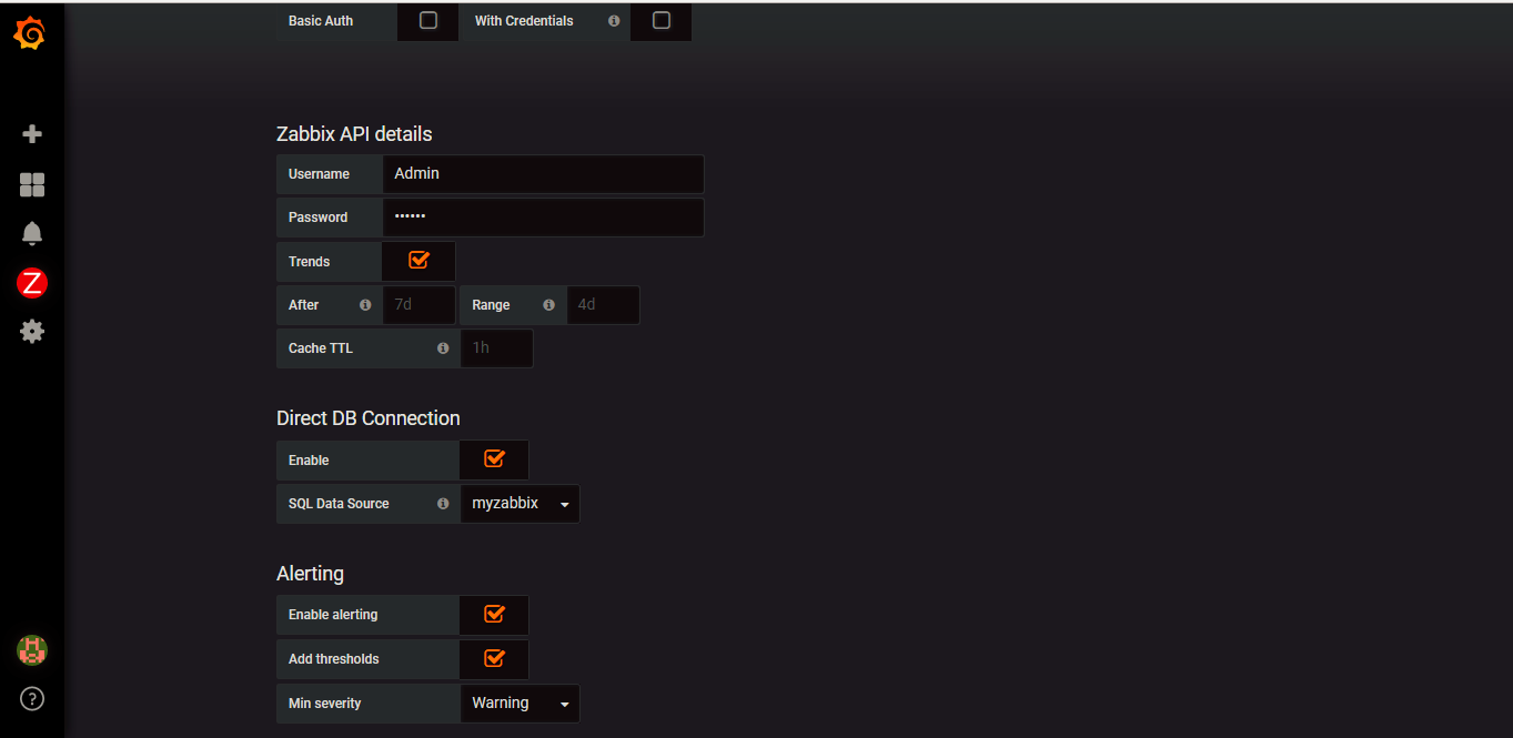 1 wget https://s3-us-west-2.amazonaws.com/grafana-releases/release/grafana 2 yum -y install grafana-5.0.2-1.x86_64.rpm 3 systemctl enable grafana-server 4 systemctl start grafana-server 5 grafana-cli plugins list-remote #显示插件信息 6 #安装插件方式一: 7 grafana-cli plugins install alexanderzobnin-zabbix-app 8 #安装插件方式二(git): 9 cd /var/lib/grafana/plugins/ 10 git clone https://github.com/alexanderzobnin/grafana-zabbix 11 service grafana-server restart