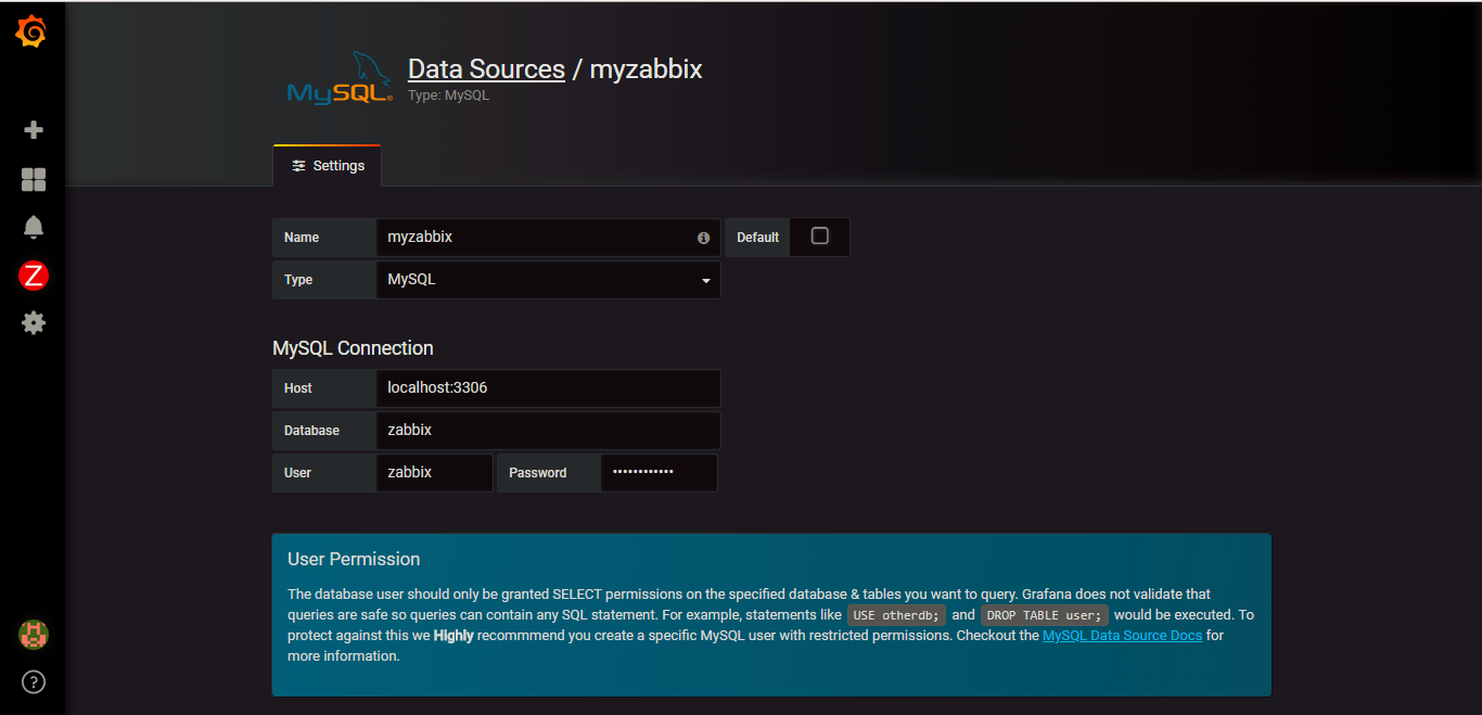 2.需要配置在grafana上添加zabbix数据库、用户、密码