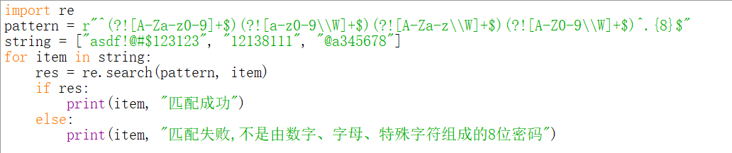 实践1:匹配出由“数字、字母、特殊字符”这三种字符组成的8位密码: