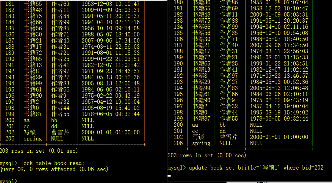 1.LOCK TABLE book READ -> 其他会话只能读也不能写